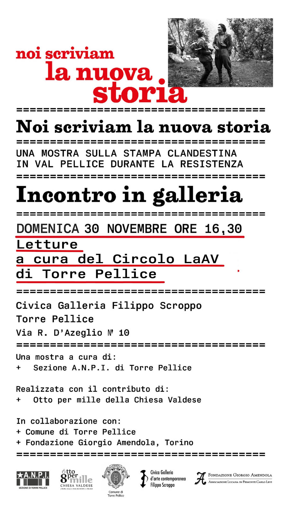 Le iniziative nell’ambito della Mostra “Noi scriviam la nuova storia – la stampa clandestina in Val Pellice durante la Resistenza”, allestita nella bella Civica Galleria Filippo Scroppo, continuano domenica 30 novembre alle 16,30 con le letture proposte dal Circolo Letture ad Alta Voce di Torre Pellice, nella sede dell’esposizione, via R. d’Azeglio, 10, Torre Pellice.