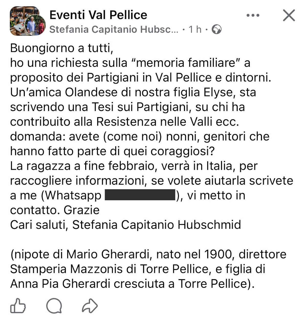 La signora Stefania Capitanio Hubschmid, nipote di Mario Gherardi, direttore della Stamperia Mazzonis di Luserna San Giovanni nel periodo della Resistenza (in un sottofondo del furgone della Stamperia che faceva la spola con lo stabilimento di Torino viaggiò tutta la stampa clandestina che usciva dalla Tipografia L’Alpina), informa che una giovane ricercatrice olandese impegnata in una tesi sui partigiani intende raccogliere in Val Pellice e dintorni testimonianze e memorie familiari da utilizzare per il suo studio.