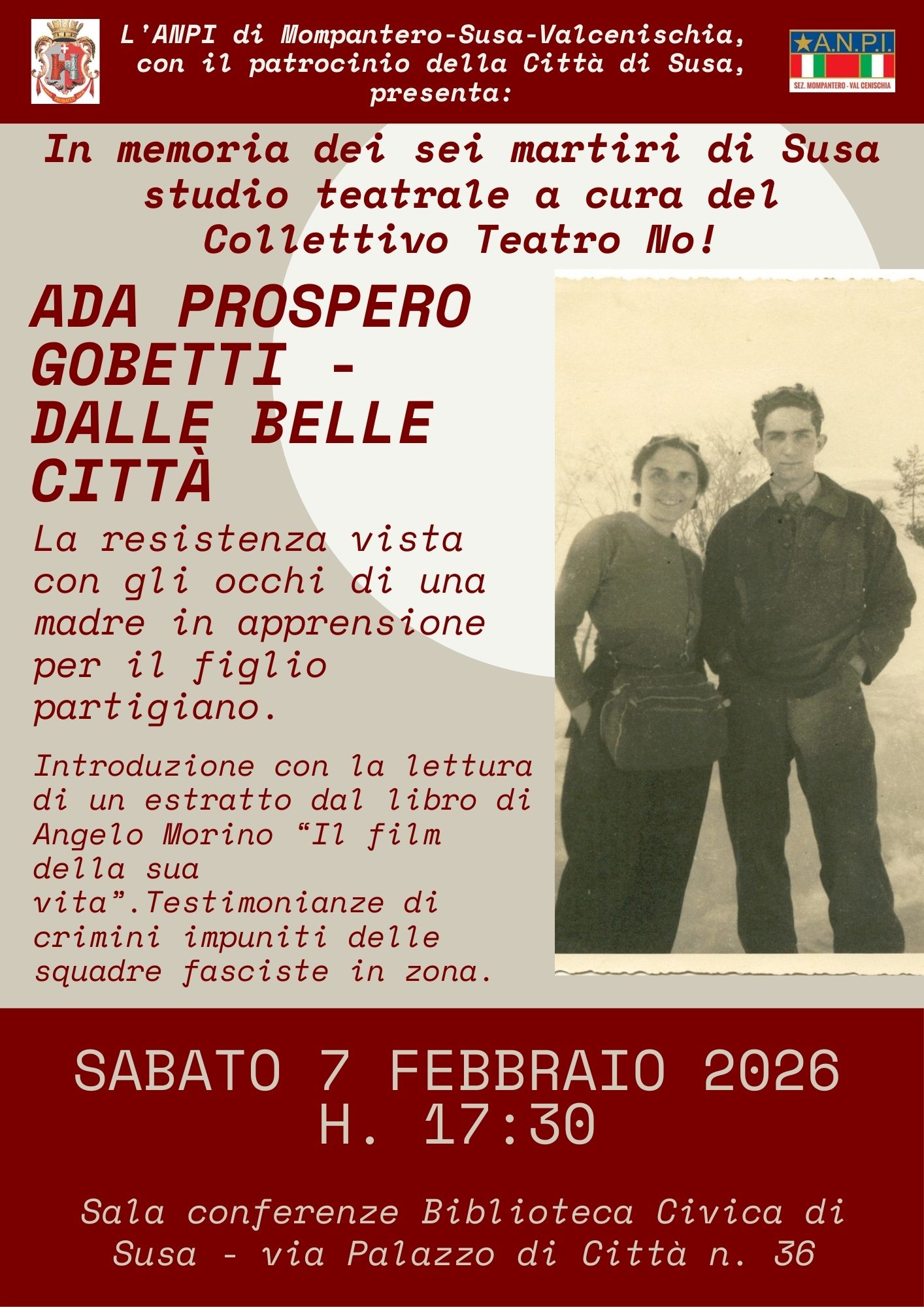 Sabato 7 febbraio alle ore 17 nella Sala delle Conferenze della Biblioteca Civica di Susa in via Palazzo di Città 36, l’ANPI di Mompantero – Susa – Valcenischia col patrocinio della Città di Susa presenta il Collettivo Teatro NO! in