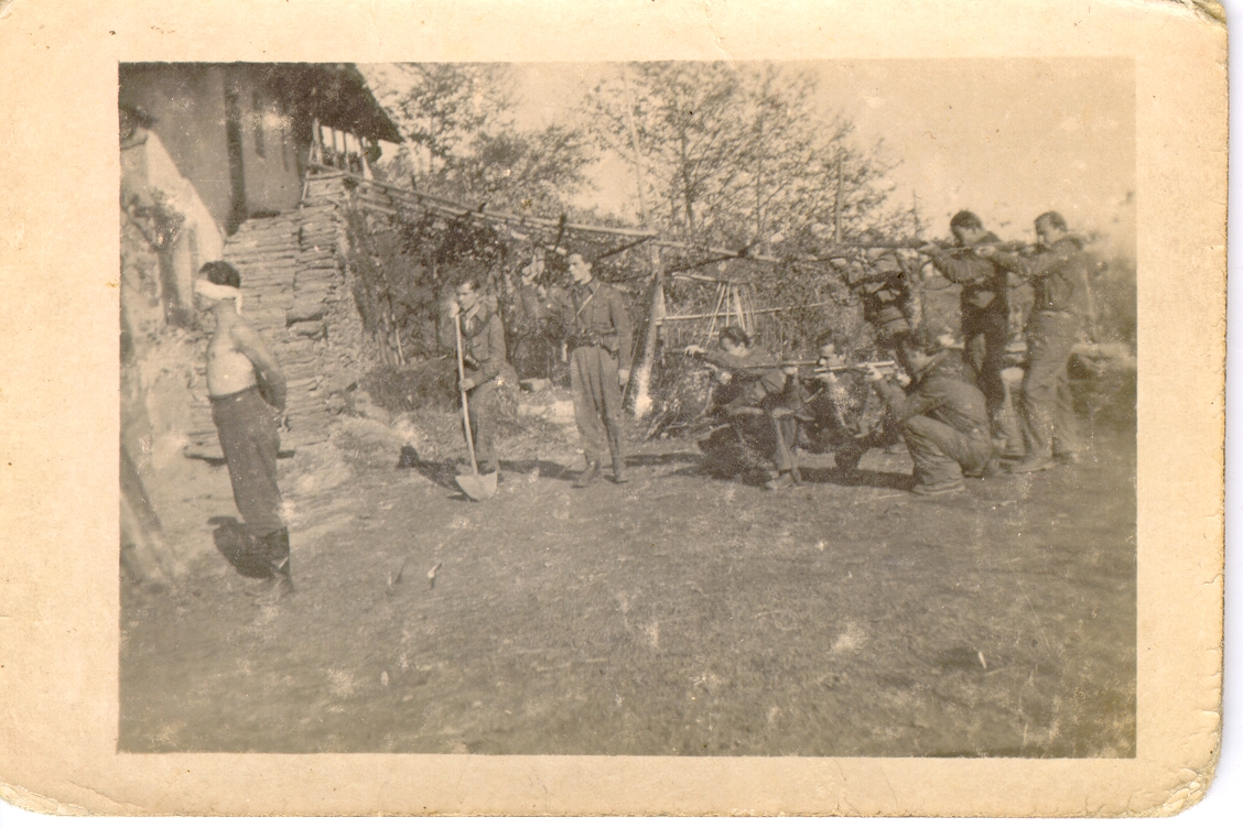 Secondo le informazioni a suo tempo acquisite da Bianchi e Falco, siamo alla base comando del Triboletto nell’autunno del 1944, e quella che si è fatta così tanto fotografare è la squadra di Rostan; in questa foto sta procedendo ad una esecuzione… Non osiamo pensare che sia una messinscena, sarebbe troppo macabra.
