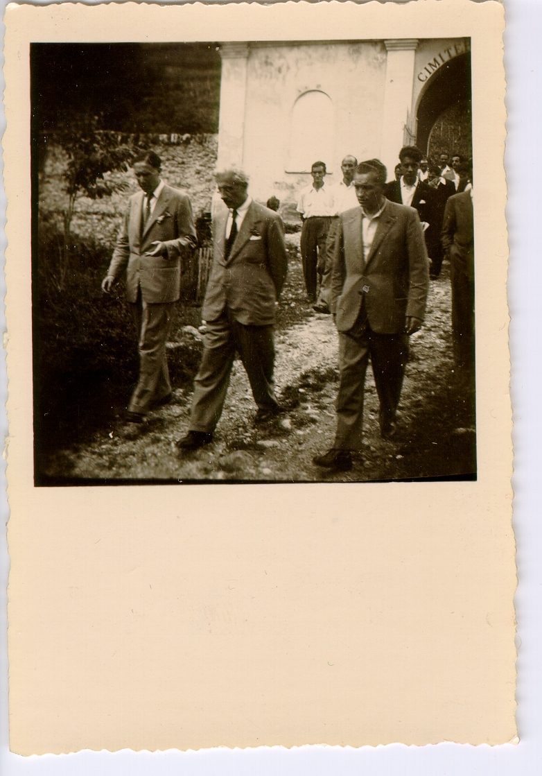 Nella foto di gruppo Abele è il secondo da destra in alto, sorridente. In piedi al centro, il signore coi capelli bianchi è Ferruccio Parri; sulla stessa fila il secondo da destra è Antonio Prearo. Nell’istantanea, al centro Ferruccio Parri, a destra Antonio Prearo.