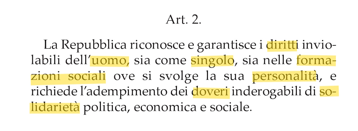 L’art. 2, in contrapposizione col totalitarismo fascista, proclama solennemente: