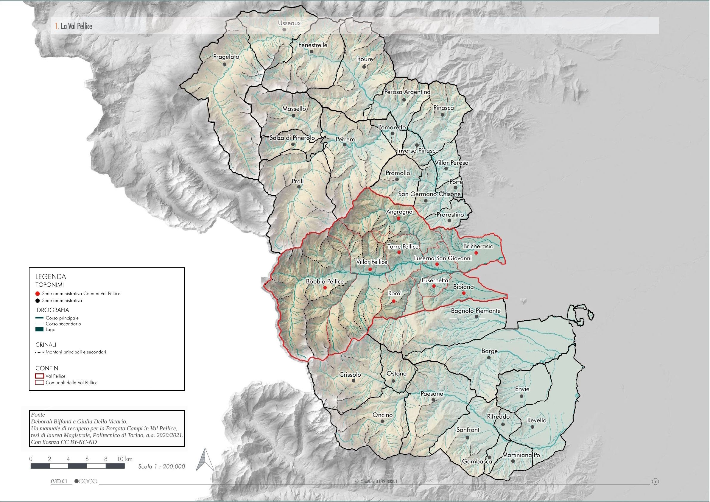 Il leggero solco che serpeggia a metà della fotografia lungo la linea d’ombra è il Pellice, la linea retta parallela al suo corso a destra è la strada proveniente da Pinerolo, il primo agglomerato di case la frazione Airali di Luserna San Giovanni, più a sinistra Torre Pellice. Dagli Airali si diparte verso il basso la Valle di Luserna, da Torre Pellice verso l’alto quella di Angrogna; nettamente distinguibili le strade di fondovalle.